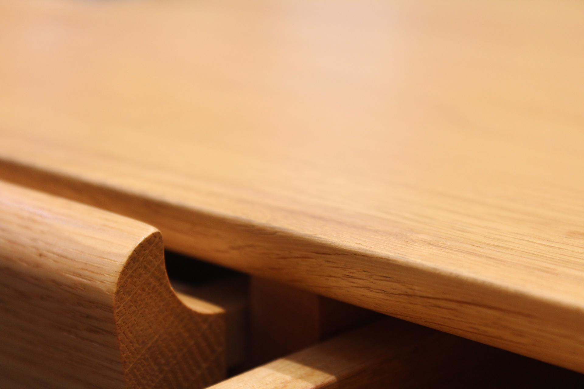 The Dakota desk features a unique library shelf, providing structural stability and storage for magazines and papers. Made from oak solids and veneers with profiled drawer handle detailing. Manufactured by DeepGreen.