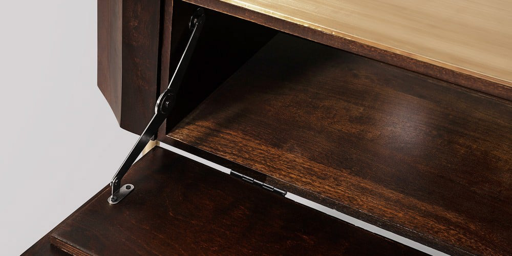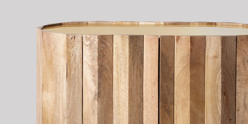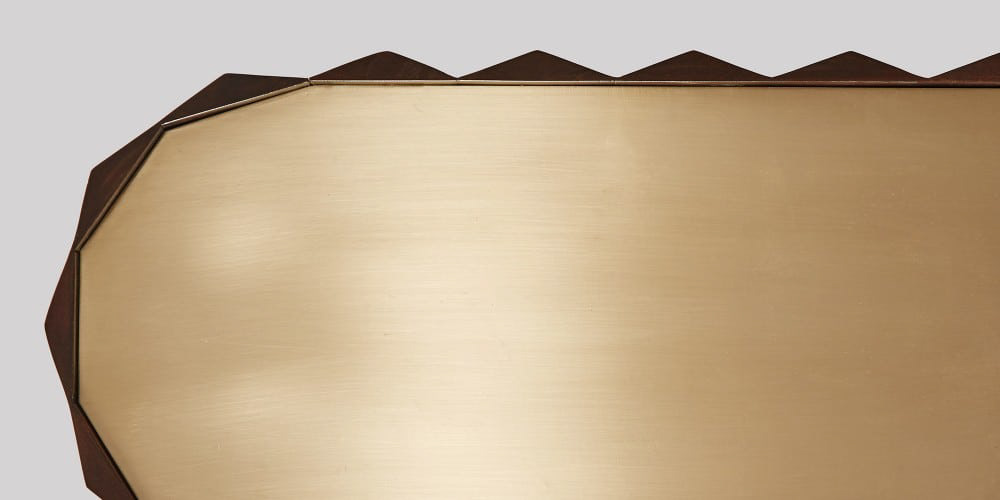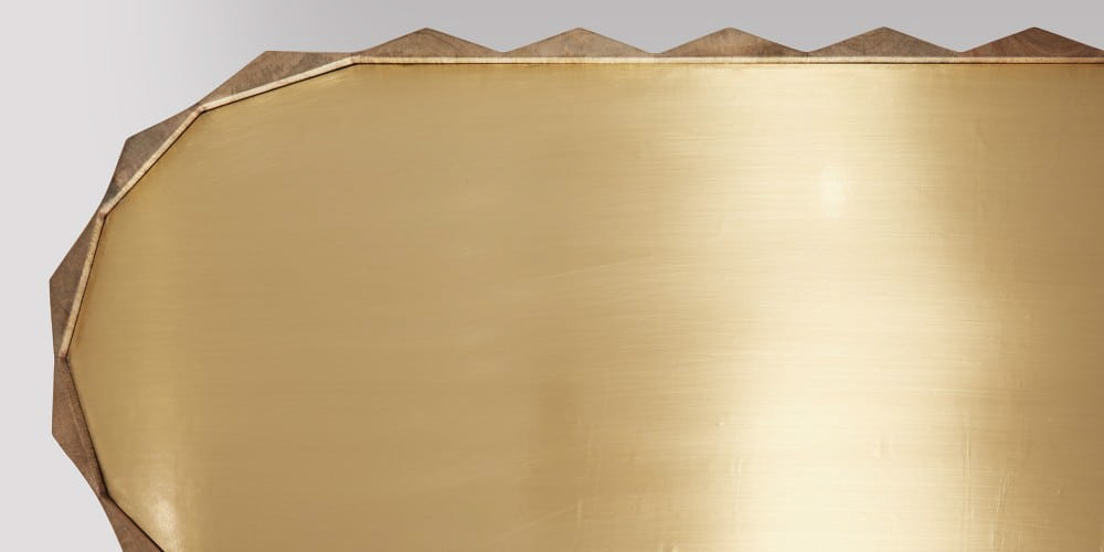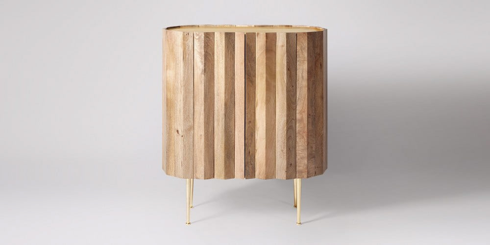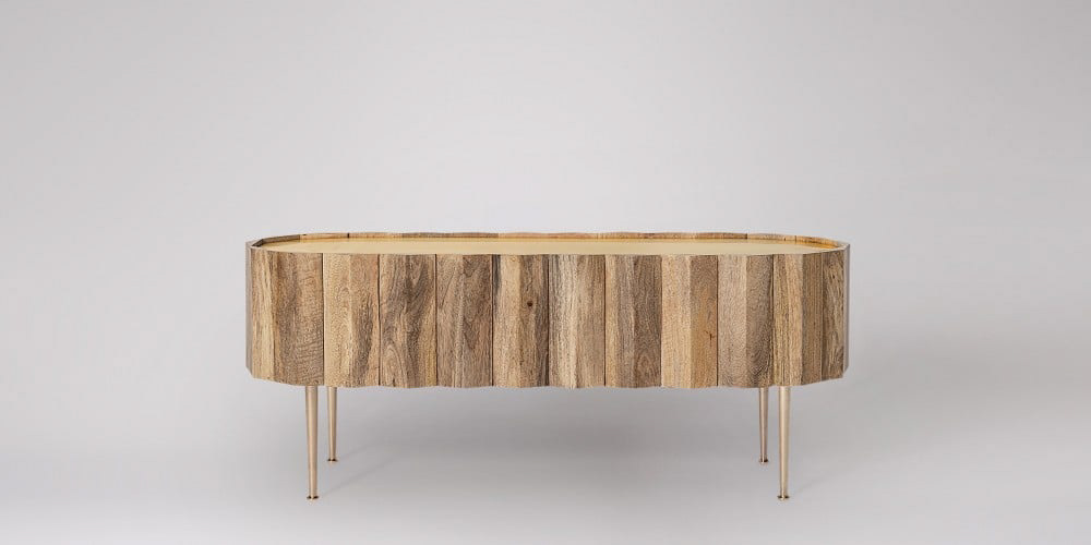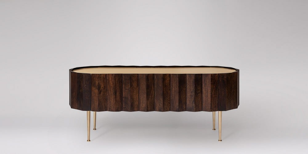 Manufactured by Swoon Editions, Kiln is a lozenge shaped cabinet range made in solid mango wood with a brass foiled top. The textured wood profile adds pattern to modern interiors and is complimented by the tapered brass plated feet.