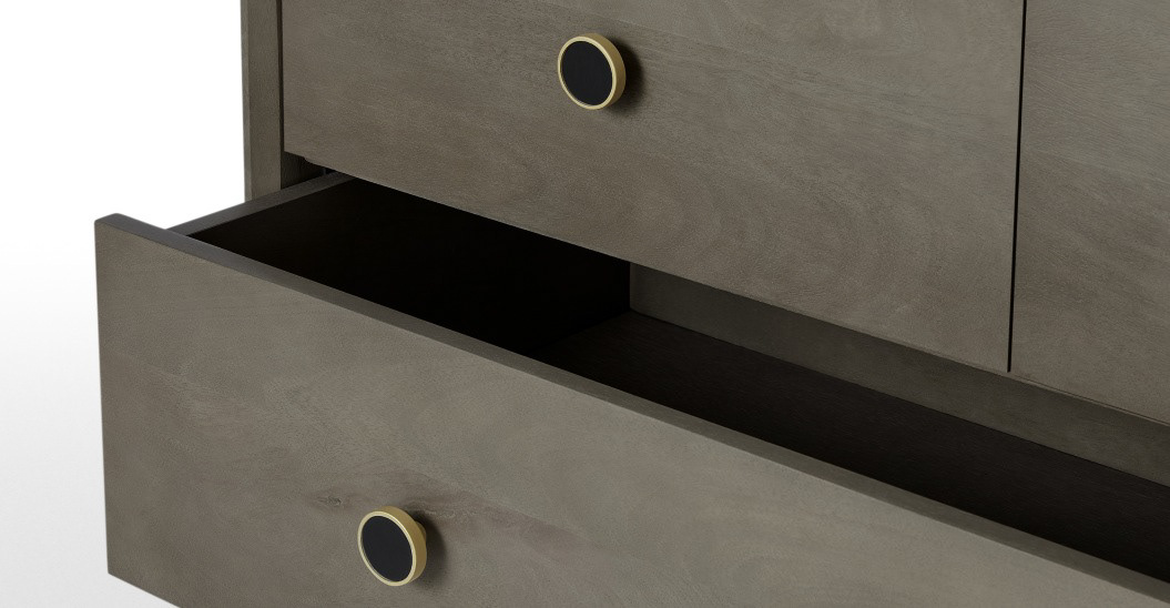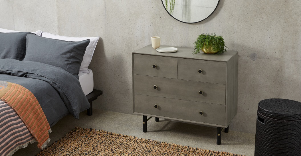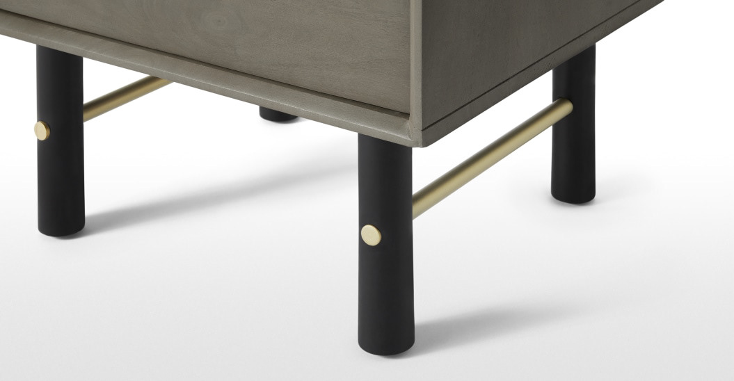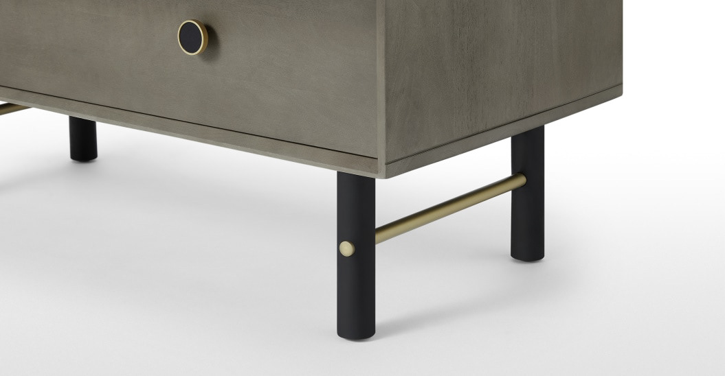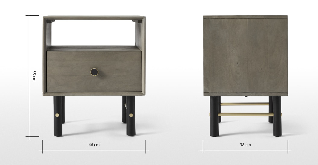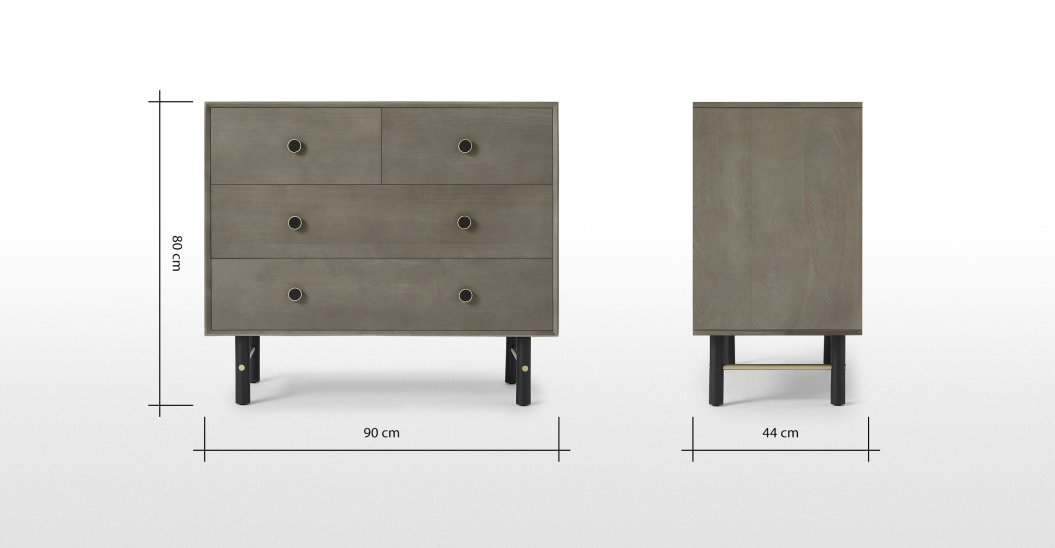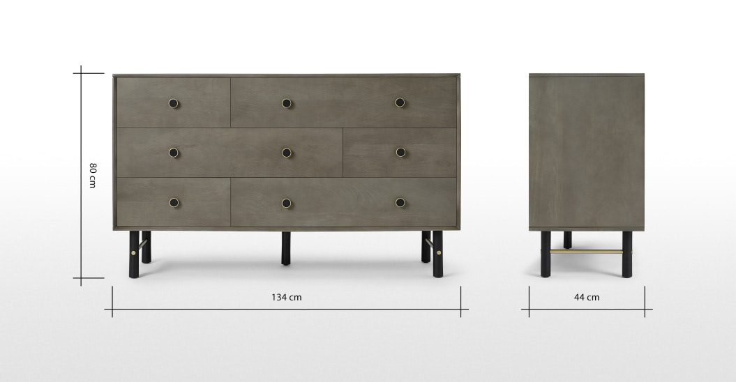 Manufactured in grey washed mango wood with gold accent handles and leg bracing, Liaka is an industrial, luxe range of bedroom storage pieces. Designed for Made.com