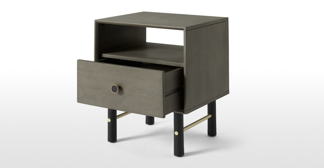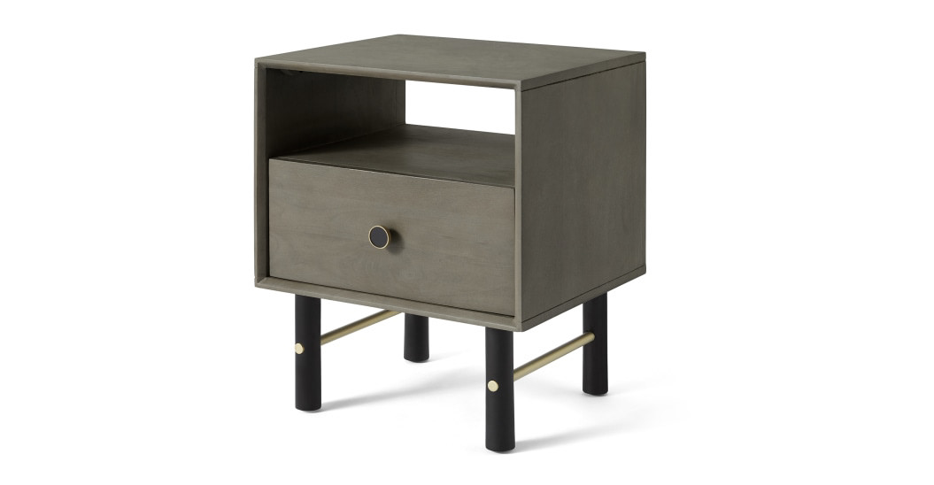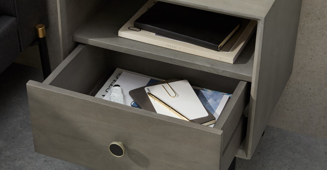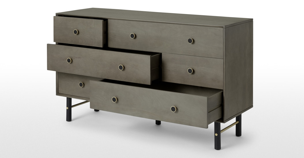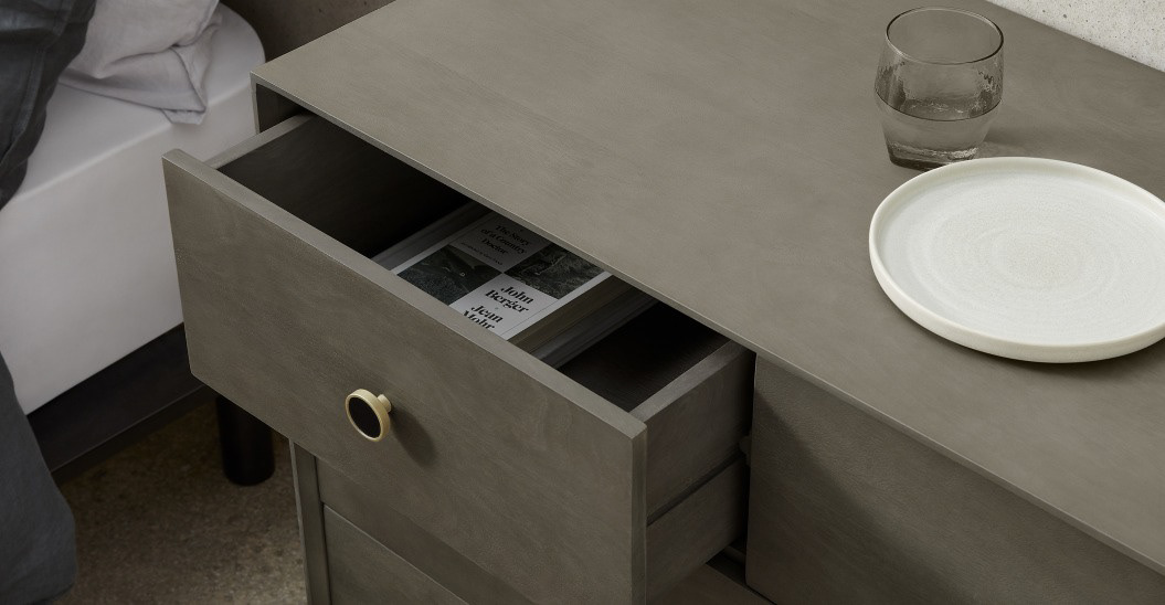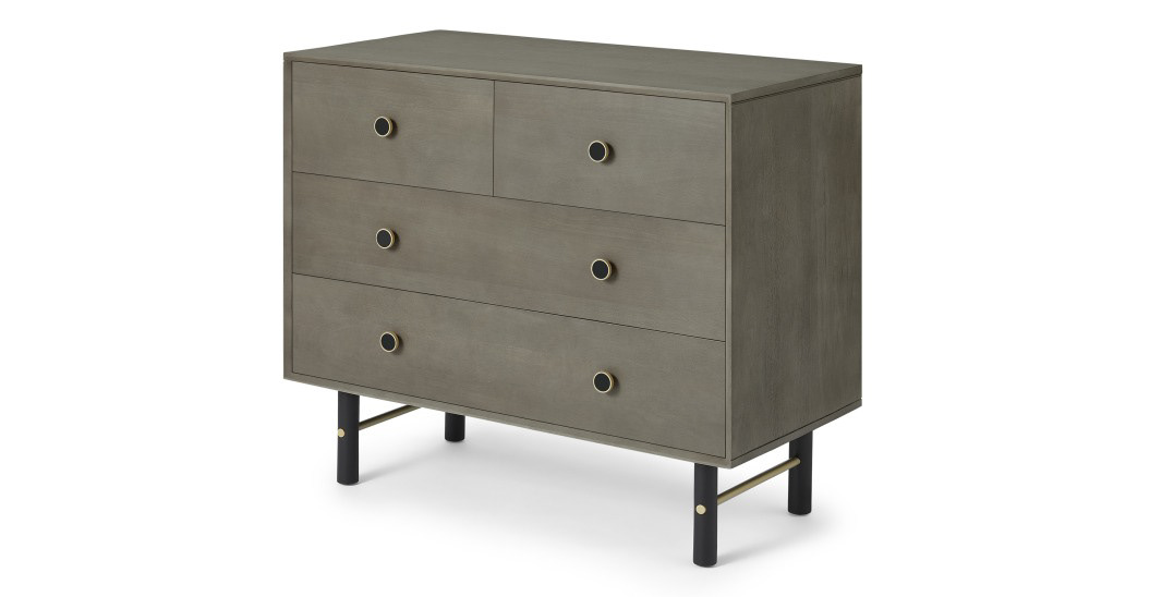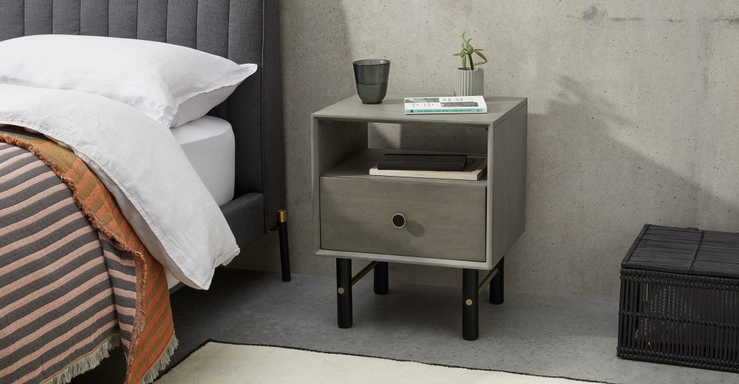 Manufactured in grey washed mango wood with gold accent handles and leg bracing, Liaka is an industrial, luxe range of bedroom storage pieces. Designed for Made.com